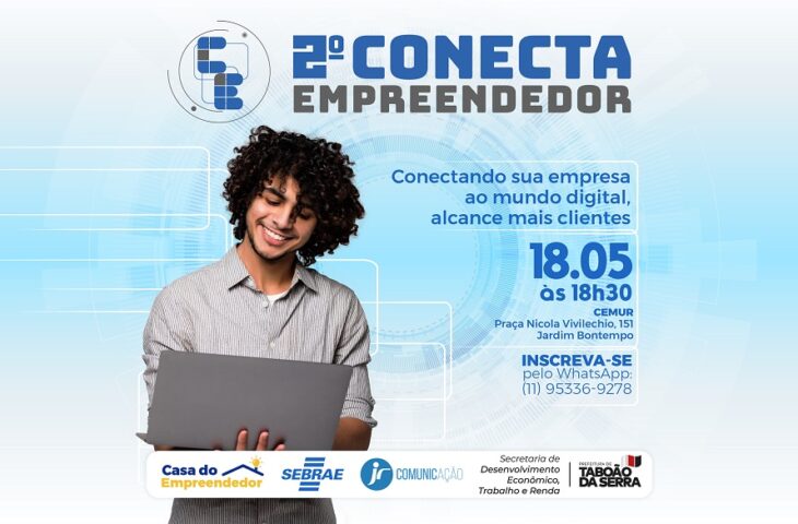 O 2º Conecta Empreendedor acontecerá no dia 18/05, às 18h30, no CEMUR (Praça Nicola Vivilechio, 151, Jardim Bontempo) e terá como tema “Conectando sua empresa ao mundo digital, alcance mais clientes”. Interessados já podem se inscrever através do WhatsApp (11) 95336-9278.