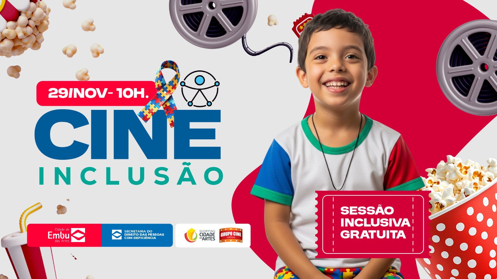 A Prefeitura de Embu das Artes, por meio da Secretaria dos Direitos da Pessoa com Deficiência, realizará no dia 29/11 mais uma edição do projeto Cine Inclusão, em parceria com o Grupo Cine e o Shopping Cidade das Artes. A iniciativa é totalmente gratuita e pensada para garantir lazer, conforto e acessibilidade para pessoas com deficiência e seus familiares.