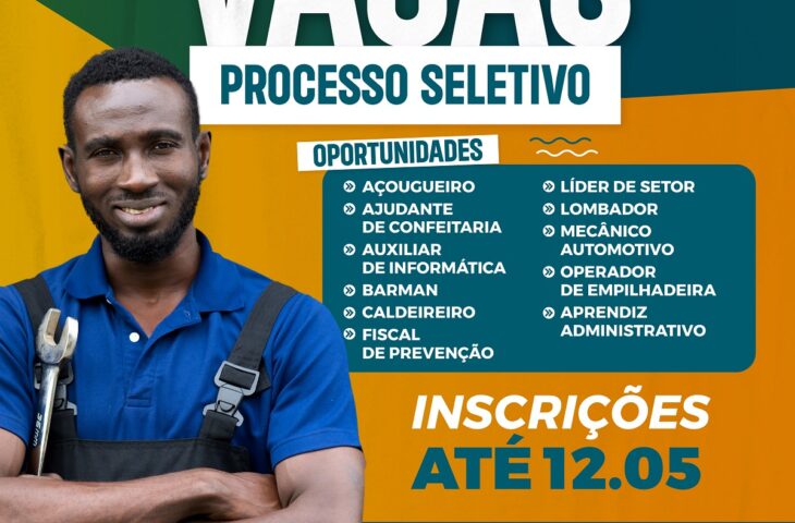 As oportunidades com inscrições abertas são para os cargos de Açougueiro, Ajudante de Confeitaria, Auxiliar de Informática, Barman, Caldeireiro, Fiscal de Prevenção, Líder de Setor, Lombador, Mecânico Automotivo, Operador de Empilhadeira e Aprendiz Administrativo.