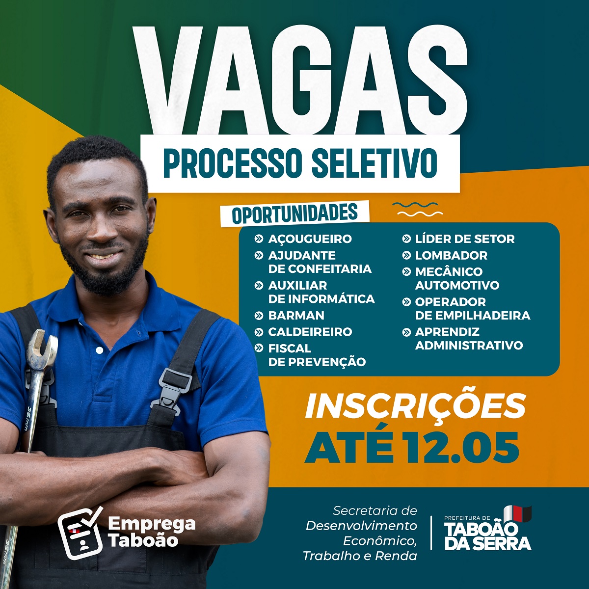 A Secretaria de Desenvolvimento Econômico, Trabalho e Renda de Taboão da Serra está com novas oportunidades de emprego com inscrições abertas, até quinta-feira, 12/05, para participar de processe seletivo. Para se candidatar, o morador de Taboão da Serra que atender ao perfil ofertado deve comparecer pessoalmente em uma das unidades do Emprega Taboão, seja na sede da SDE, na Rua Cesário Dau, 535, no Jardim Maria Rosa ou na unidade Pirajuçara, na Estrada Kizaemon Takeuti, 1987. É necessário levar documento oficial com foto, carteira de trabalho (física ou digital) e currículo atualizado.
