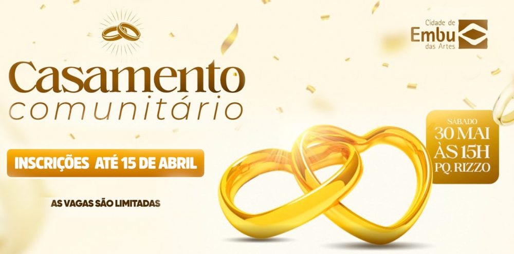 A Prefeitura de Embu das Artes, por meio da Secretaria de Desenvolvimento Social, prorrogou até o dia 15/4 as inscrições para o Casamento Comunitário, voltado a casais de baixa renda interessados em oficializar a união civil.