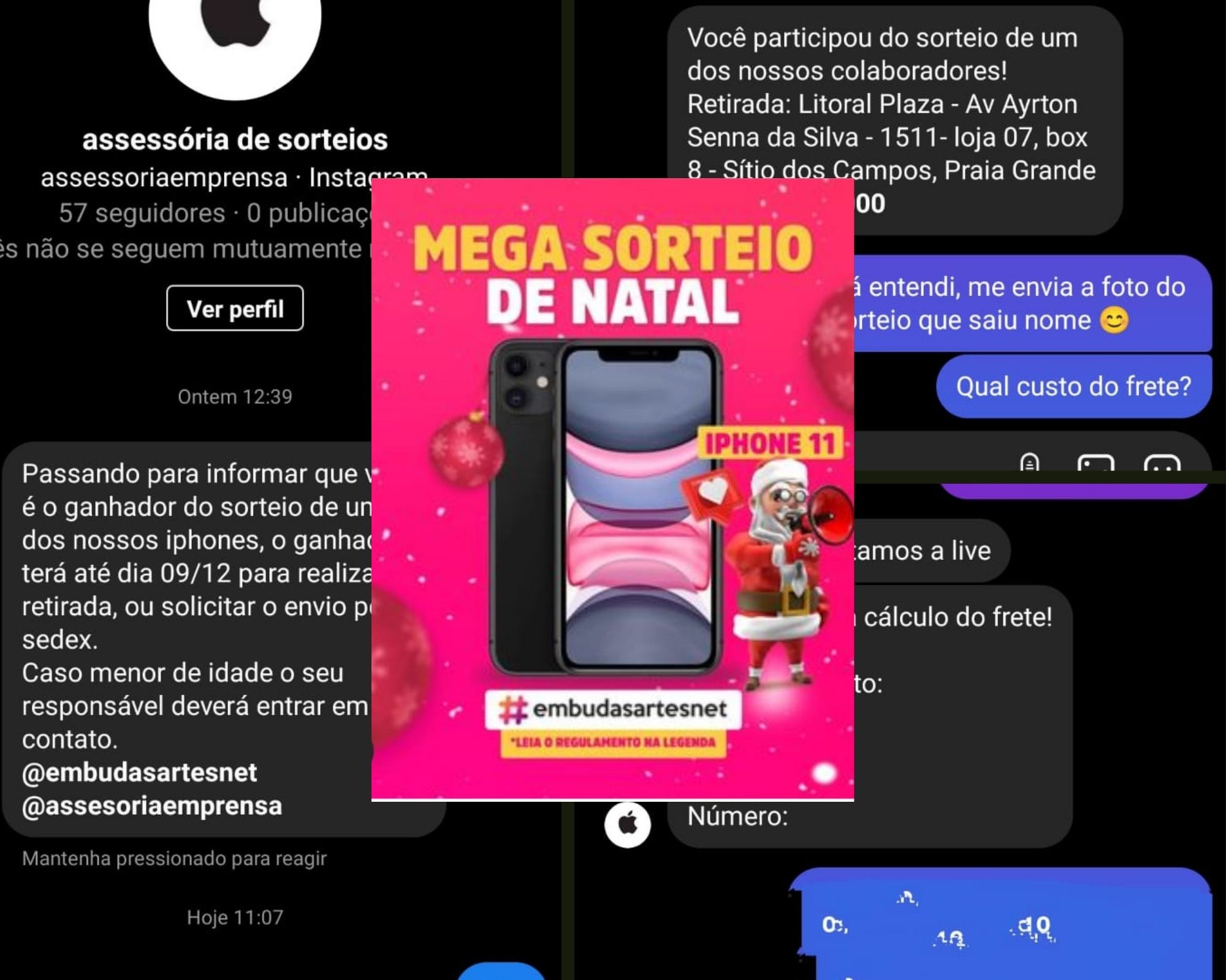 Na manhã desta quinta-feira, dia 9/12, diversos seguidores e participantes do sorteio do instagram @embudasartesnet, receberam mensagens informando que a pessoa seria o ganhador do sorteio, porém precisava pagar o frete e assim receber o Iphone. A proprietária do instagram, Alessandra Vespa fez stories em seu perfil para alertar os seus seguidores sobre o golpe e destacar que o anúncio do ganhador será feito exclusivamente por ela, e apenas no dia 23/12.